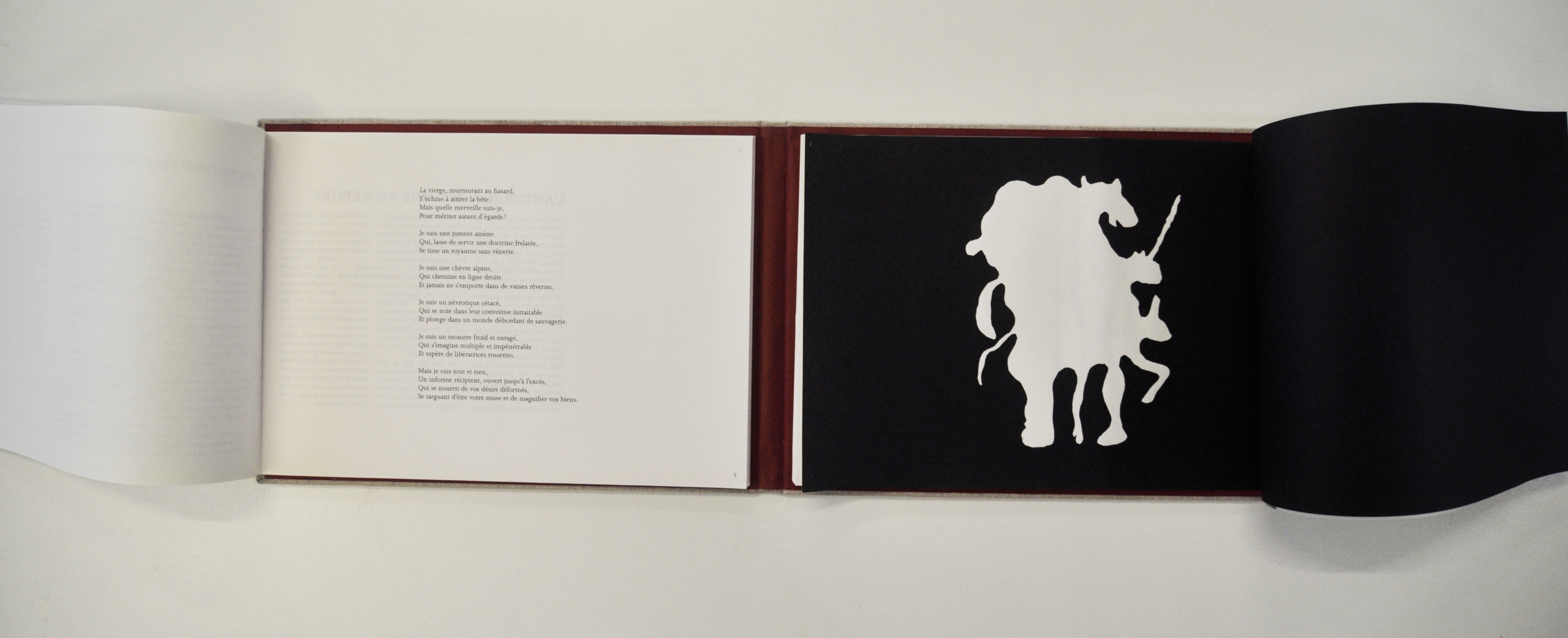 Bestiaire réalisé en collectif à partir du texte de Yannick Haenel, Les animaux sont mes initiateurs. Création du contenu sur la licorne, conception, réalisation graphique et fabrication de l’objet, 2018.